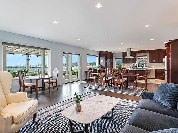 Prime walk-on beachfront living awaits at Admiral Point in Columbia Beach, with a raised sea wall framing unobstructed ocean vistas. Built in 2015, this 3027 sq. ft. residence offers an open concept design with floor-to-ceiling views of French Creek Marina and marine life unfolding at your doorstep. The firelit great room commands front-row seating for the ever-changing waterfront panorama, while the state-of-the-art kitchen and dining room stand ready for entertaining, enhanced by new tile flooring in the entry, kitchen, and fireplace surround. The main-level primary suite provides comfort and privacy, with a guest bedroom and flexible den or 3rd bedroom upstairs. An ocean view recreation room with wet bar sets the stage for games or gatherings. Outdoor living shines with a pergola and al fresco dining, complemented by a low-maintenance seascape yard. Hot water on demand, a 2-car garage, and extra parking completes this exceptional oceanfront offering.