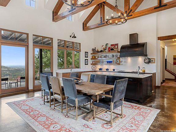 Timeless Hill Country Family Estate situated on nearly 18 awe-inspiring acres offers complete serenity and panoramic long range vistas, free roaming exotics, and is contiguous to an 80-acre nature preserve with 2 fishing lakes, hiking trails and seasonal creek. Understated elegance is carried throughout this Estate, comprised of 4 stunning dwellings: a 4671sf main residence features primary suite plus 2 guest rooms on the first level, an office, media room, and full bath located on the second level, attached 3 bay garage, detached carriage house with 2 bay garage and fully outfitted guest quarters above. Side by side casitas with ensuite baths, and 2-story Legacy barn and workshop complete the package. Thoughtfully crafted in 2013, this 4671 +/- sf this homestead emanates a rare blend of superior construction and character. The great room showcases soaring ceilings adorned with hand-hewn timber tresses and custom wrought iron chandeliers. Anchored on each end by an impressive stone fireplace and marvelous gourmet kitchen overlooking a 14+/- acre lake highlighting captivating easterly views. Beyond the expansive continental island is a handmade La Cornue Chateau Model Range. The integrated sub zero refrigeration bank featuring fridge, freezer, and 60 bottle wine cooler, as well as walk-in butler's pantry with built-in Miele coffee bar and microwave oven make entertaining a breeze. A true sanctuary, the primary ensuite is an oasis of exquisite architecture and bespoke design, from the sleek travertine shower with a view, to the claw foot soaking tub, and dual quartz vanities flanking the entrance to a luminous custom closet. Guests may retreat to 2 bedrooms suitable for king size beds and a full double vanity bath. Custom utility and safe rooms compliment the intuitive design. The second level birds-eye views of the surrounding rolling hills, is currently outfitted with the ultimate home theater experience, 2 murphy beds, office and full bath. Attached to the main house, a 3 bay garage, 240v EV charging station, and enclosed tool shop. A spacious 2 bay garage and workout center lies beneath a fully outfitted guest quarters complete with kitchenette, dining area, ensuite bath and walk-in closet featuring some of the most picturesque views of Hill Country. Newly constructed guest casitas are stylish and inviting, both with stellar vistas, lofty ceilings, and private ensuite baths. All living and guest quarters are plumbed to a 55k gallon rainwater harvesting and purification system in addition to a 690' cased well currently in place. A classic timber framed barn is cited on the perimeter of the high fenced homestead, temperature controlled and clad in T&G knotty pine throughout. Just inside rustic sliding barn doors, are hydraulic roll ups, an enclosed workshop, veranda with lake view, full bath, and versa lift to the second level which can serve as an office, art studio, gym or bedroom. The homestead was curated for as much enjoyment indoors as out. The pool is perfect for splashing around or swimming laps, enjoy soaking in the spa while gazing out at the extensive views and wildlife. The homestead has two propane tanks, a 1000 gallon supplies all structures, and a 500 gallon supplies the Generac whole-house generator. This community, aptly named, Ranches of Brushy Top, is an impressive high fenced 2000+ acre ranch host to exotic wildlife such as Elk, Lechwe, Black Buck, Sika, Oryx, and more. Amenities include gated entry, 2 large lakes offering excellent fishing, swimming, and kayaking paired with miles of trails for horseback riding, hiking, or cruising in your UTV through the expansive preserve. Currently 1-D-1 Ag exempt, no city tax, low owner dues. Ideal for a primary or secondary residence, the Water's Edge Ranch is a rare, refined and unrivaled legacy estate in the wild and native heart of the hill country. Additional 20+/- acres available.