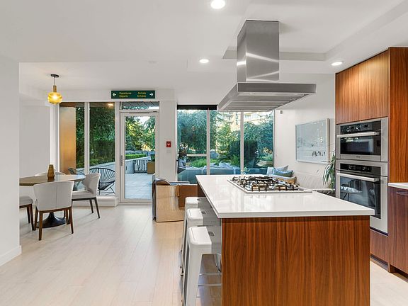 A BEAUTIFUL CITY HOME IN AN EXTRAORDINARY PARK LIKE SETTING! Walk or bike out of your own private entrance, through stunning landscaped gardens, over water features, across Hinge Park, past the off leash dog area, and straight onto the Seawall! At home, enjoy exceptional privacy and magnificent park/mountain views from both levels. The main living level is centred around a super social open kitchen (with full-size Miele wine fridge) and flows seamlessly out onto a 450 ft.² private patio for incredible indoor/outdoor living. 2 pc powder + multiple pantry/storage options. Up, both bedrooms have en suites including an opulent 5 piece primary + large dressing room. Rounding the offering out is EV parking, 24/7 Concierge, gym, party/meeting rooms, automated car wash + secure covered dog area.