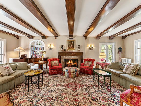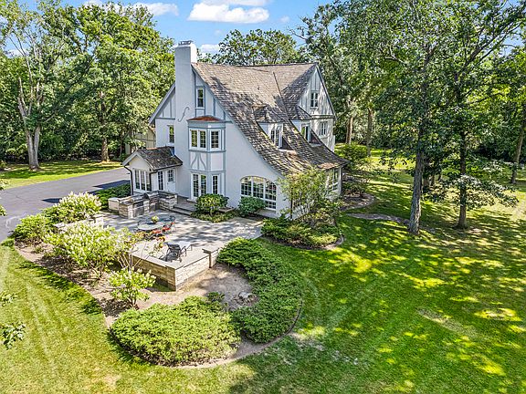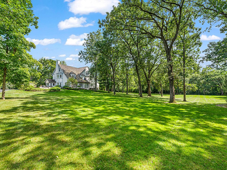 Sunset Lane ends in a cul-de-sac where you will find a gated entrance to this 5.95-acre tranquil estate. Nestled in an old growth forest, the 1/8 mile drive winds under a tree canopy over a stone bridge, opening to a vista of a manicured lawn where the home stands at the ground's hilltop. The elegant Country French-style home was designed by the acclaimed architect, William Aitken, founder of Bannockburn and completed in 1929. The Four-level home, built of half-timbering with stucco infilling and a wood shingled roof, contains large arched windows, French doors and bay windows adorning the exterior. An elegant porte-cochere leads into the home's main entrance. The foyer provides a glimpse of the gracious rooms beyond. A grand curved wrap-around staircase features an Ivy-themed wrought iron banister. The living room's old-world charm is evident with its wood-beamed ceilings which leads the eyes to the fireplace, the main focal point of this 30' x 20' room. Five pair of French doors provide wonderful light and views of the tree-lined property. The dining room is adorned with a Claude Monet inspired hand painted mural of France. This 22' x 14' room has a bay of French doors opening to a large 32' x 32' lighted bluestone patio and outdoor grill area with granite countertops and a Wolf gas grill as well as a Wolf wood burning grill. The sunroom has three walls of floor to ceiling arched windows, one of which has a door to the lawn. This room provides the feeling of year-round outdoor living. Its heated tile floor provides ample heat and a cozy environment during the winter months. The kitchen features an AGA stove, French limestone floors, wood cabinetry and granite countertops. A door leads out to the blue flagstone patio and grilling area. The side entry has a closet and back staircase leading from the lower level to the third floor. Upstairs, the primary bedroom suite is a 22' x 16' retreat with a bay window, built in window seat and dual walk-in closets. The primary bath is beautifully tiled with a double vanity, jacuzzi tub and walk in steam shower. On the opposite side fo the second floor, away from the primary bedroom are two bedrooms and a full bath and floor to ceiling built-in linen and storage cabinetry. Both bedrooms are 15" x 14'. The library on the second floor has three walls of windows providing and enchanting "treehouse" feeling. The laundry room on the second floor is 15' x 9' and offers ample built-in storage. The third-floor bedroom suite is a cozy room with beamed ceiling, walk-in closet and full bath. The third-floor gym is light and airy with windows at each end and floor to ceiling mirrors. On the lower level you will find an entertainment area 34' x 20' with two walls of built-in cabinetry. There is a half bath, four storage closets, mechanical room and stair access to the attached 2-car garage. The attached 2-car garage is heated and has storage shelves and a pet shower with hot/cold water. Across the driveway is a 3 1/2 detached extra deep garage with tool shelving with ample room for lawn-care equipment. Generac Home Generator for the unexpected power outage.