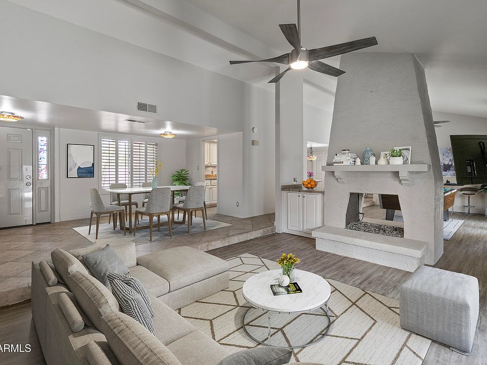 Nestled in the highly sought-after Royal Palm neighborhood, this beautifully updated 3-bedroom, 2-bath home boasts a serene and inviting setting with a large, lush front lawn and gorgeous mature trees. As you enter through the private courtyard, you're welcomed by an open layout featuring a formal dining room and spacious family and living rooms, divided by a charming dual-sided fireplace.