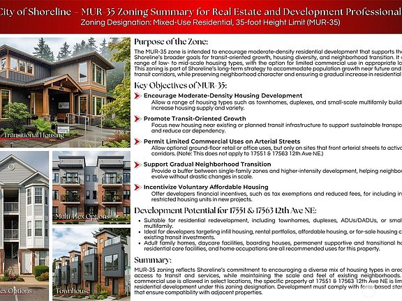 Exceptional Shoreline (MUR-35 Zoning) Moderate Density Housing Development Opportunity, as is, redeveloped, & combined with adjacent property 17563 (see MLS #2425842). This 9,426sf level lot with 66' of street frontage on 12th Ave includes a 2,050sf single-level residence with attached 580sf garage. Shoreline's new MUR-35 zoning allows for & encourages townhomes, ADUs, DADUs, duplexes, & small-scale multifamily residential development. Nearby transit minimizes parking requirements. Current residence is suitable for an Adult Family Home. Combining with neighboring 17563 adds 8,400sf & 62' of street frontage for the greatest potential. Sample drawings & site visits available. Utilities including sewer, water, power, & natural gas, on-site.