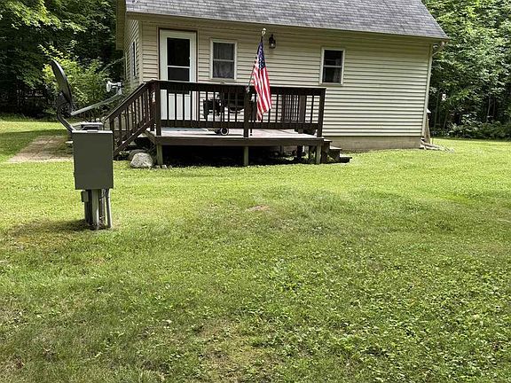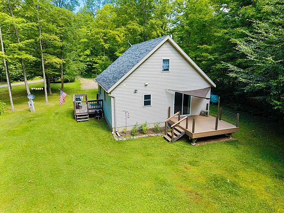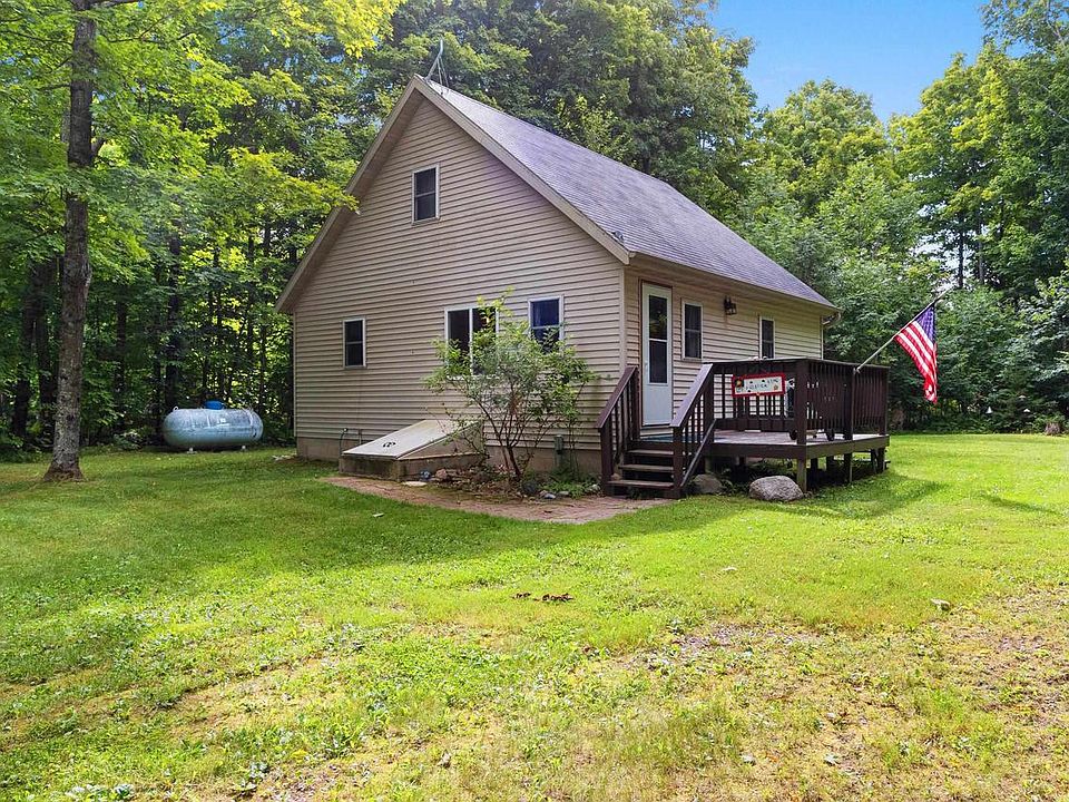 NEW PRICE! A beautiful bright gem set on 2.5 wooded acres. This 4-season home has a sun-drenched deck for enjoying the wildlife. The kitchen has hickory cabinets and an island with seating and all appliances. There is a large bathroom with storage cabinet and stackable washer/dryer. The primary bedroom is on the first floor, and a spiral staircase to the loft with bed. Includes a sofabed in the living room. The garage is newer and will accommodate all your toys. Come and enjoy the lakes (the Horn Lake boat landing is nearby)!