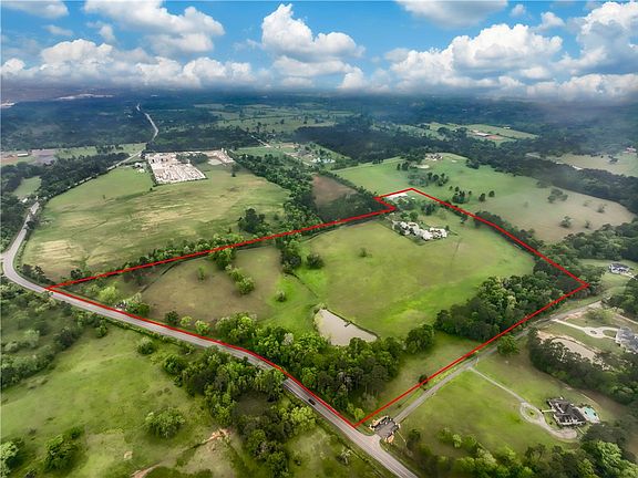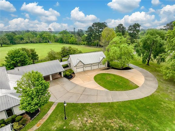 Nestled on 47± acres of rolling hills, this exceptional ranch offers the perfect blend of comfort, functionality, and resort-style living in a peaceful country setting. A striking architectural entry with iron fencing, stone columns, and a paved driveway welcomes you to a beautifully designed estate featuring a main house, guest house, and pool house—all centered around a sparkling pool and spa. The single-story main home showcases an open-concept layout that seamlessly connects the island kitchen, breakfast and dining areas, home office, and multiple living spaces. The private primary suite includes a cozy sitting room with a fireplace, a luxurious ensuite bath with double sinks, a walk-in frameless shower, and a spacious custom closet. The charming guest house features built-in bunkbeds and a full bath, while the pool house adds additional space ideal for entertaining. Outdoor living is elevated with expansive porches, a terraced patio, outdoor fireplaces, a full kitchen, a 4-car air-conditioned garage, and a 4-car carport. Designed for both lifestyle and practicality, the property also includes a barn, workshop, equipment shed, RV building, cattle pens, fenced pastures, and peaceful ponds—fully equipped and ready for your ideal rustic retreat.