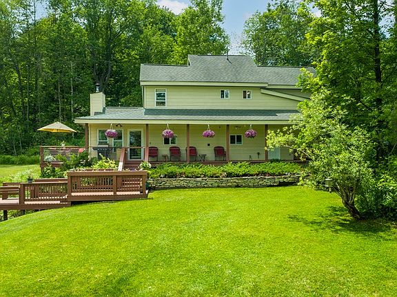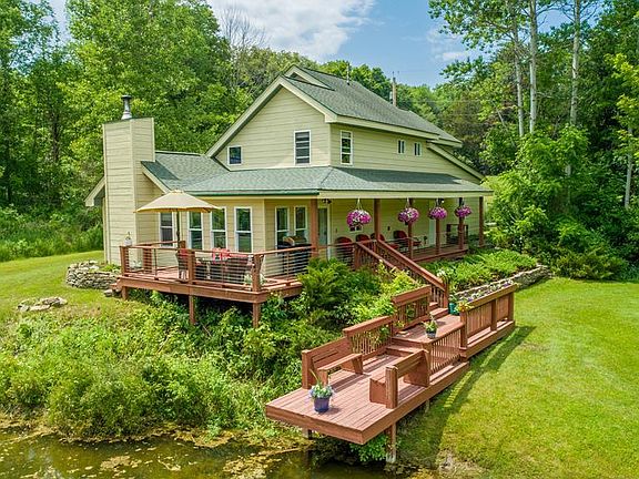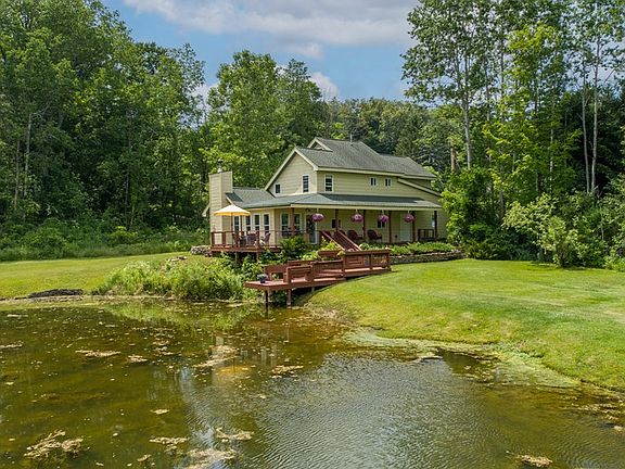 Remarkably well-built custom home five minutes south of Watkins Glen. Close to local attractions! Open concept main living space with vaulted ceilings and beautiful stone wood-burning fireplace. All season room overlooks the serene landscaping and large stocked pond. Wrap around deck leads you outside to experience the surrounding natural features. First floor primary en suite, second floor en suite plus 2 additional bedrooms and bath. Meticulously maintained, attention to detail and quality materials throughout interior and exterior. Large detached garage/workshop with separate septic nearby.