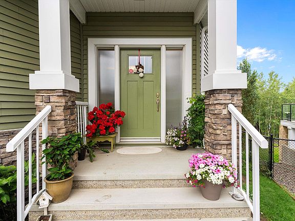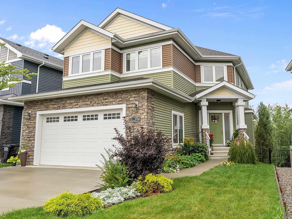 Modern custom-built walkout backing trees & trails! Bright open main floor with tile flooring, linear fireplace & patio doors to a covered, glass-railed deck. Designer kitchen features white cabinetry + navy island, quartz counters, subway backsplash, stainless appliances, and a large island with sink & built-in microwave. Dream laundry room with sink & builtin Cabinetry. The primary retreat offers a spa ensuite with a free-standing tub and oversized glass shower with a rain head. The walkout level extends your living space with access to a second covered patio and the yard. Oversized double Garage with floor drain, Quiet cul-de-sac in the Big Lake area—steps to pathways and parks, with quick access to the Henday, Yellowhead & St. Albert. Too many upgrades to list.