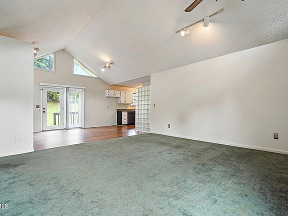 perfect for modern living and entertainment. The living room boasts vaulted ceilings, enhancing the