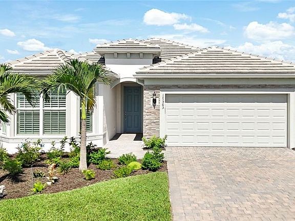 Price adjusted! Enjoy breathtaking sunset views from this stunning, almost new, 2023 Pulte Distinctive Series Palmary model. Featuring 2 bedrooms plus a den and 2 full baths within nearly 2000 sq ft, this home is loaded with both builder upgrades and owner updates. The gourmet kitchen features a built-in configuration, quartz countertops, under cabinet lighting, expanded 42' cabinetry, an upgraded tiled backsplash, and a silgranit sink. The primary bath offers a private oasis with a walk-in shower surround featuring extended tile walls, dual shower heads, and expanded cabinetry for ample storage. Plantation shutters adorn the home, complementing ceiling trays, LED down lighting, 8' doors, and tile flooring in the main living areas. The garage has been expanded to accommodate storage, a second fridge, or golf cart, and includes an EV port for charging. Step onto the extended screened lanai, perfect for al fresco dining, lounging, and entertaining. Located just a short walk from brand-new amenities including a resort-style pool with lap lanes, spa, fire pit area, sports courts, state-of-the-art fitness center, restaurant with poolside bar & grill, and demo kitchen. Conveniently situated 1 mile from I-75 and minutes from Ft. Myers River District, Gulf beaches, golf courses, marinas, medical care, restaurants, and major airports. Don't wait to make this new and amazing 55+ community your home!