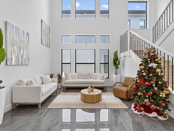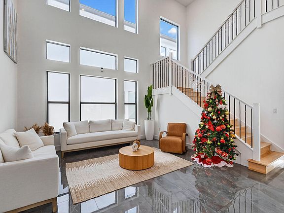 From the moment you enter, a dramatic double-height great room sets a striking tone, illuminated by expansive floor-to-ceiling windows and enhanced by extensive recessed LED lighting added throughout the main living areas. Oversized polished marble flooring flows seamlessly across the 1st level, amplifying the home's bright, airy ambiance. A sculptural architectural staircase featuring stained white oak treads, risers, and a sleek Aalto rail system serves as a stunning focal point, connecting the living spaces to the 2nd level with modern elegance. The primary living area is further elevated by a custom marble feature wall with an integrated entertainment system, warm wood slat accents, chandelier-ready support, HDMI wall wiring, and thoughtfully added outlets for today's connected lifestyle.