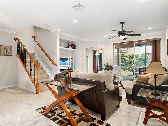 Move-in ready and turnkey furnished, this 3-bedroom, 2.5-bathroom home offers comfort and convenience in Timberwalk. Perfectly situated on a quiet street just steps from the clubhouse, it’s ideal for enjoying relaxed Southwest Florida living. The open living & dining area features crown molding, recessed lighting, and sliders to a spacious screened-in lanai, perfect for enjoying the Florida weather. The kitchen shines with stainless steel appliances, a tile backsplash, and a walk-in pantry. Upstairs, a loft provides the perfect flex space for a home office, media room, or play area. The primary suite boasts an ensuite bath with a shower, soaking tub, and walk-in closet. Two additional bedrooms and a full bathroom ensure space for family & guests. Highlights include a separate laundry room, extra storage cabinets in the garage, accordion storm shutters for the second floor, updated light fixtures in the dining area & foyer, and a built-in entertainment center in the living room. Low HOA fees cover cable & internet, and amenities include a pool, fitness center, and playground—perfect for families or those with active lifestyles. Located near RSW, Gulf Coast Town Center, Coconut Point, FGCU, and stunning beaches, enjoy easy access to dining, shopping, & entertainment. Plus, its location outside a flood zone offers peace of mind. Make this beautifully furnished home yours and embrace the best of Southwest Florida living!