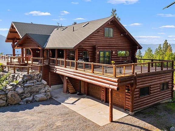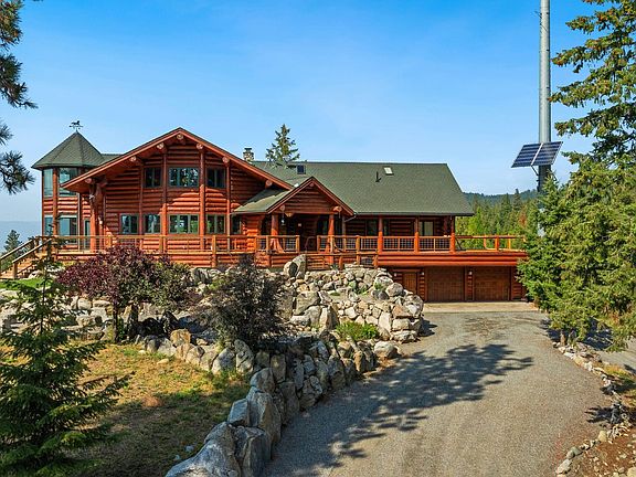 Extraordinary unique Caribou Creek Log Home set atop a dramatic granite outcrop. 28 private acres overlooking the breathtaking 360° views of the Kootenai River, this luxurious off-grid home blends timeless craftsmanship w modern sustainability. The 3-bed, 2 full + 2 half bath home features a massive stone fireplace, a gourmet kitchen w granite counters, and a glass-surround dining room; home features views and natural light from every room. A full-size elevator connects all three levels for convenience. Architectural details include hand-scribed logs, live-edge tree posts, and an “eagle’s nest” room wrapped w windows. Fully independent—off-grid, w state-of-the-art alternative systems and a 40 gpm well. Includes a 40x60 shop w wood heat, built-in shelving, and a loft; a generator shed; terraced rock landscaping; wraparound decks; and borders USFS. Plus a 960 sq ft 1 Bed/1 Ba guest cabin features a full kitchen, bath, and open loft, complete w generator, propane/wood heat, and septic.