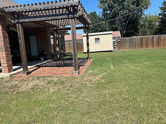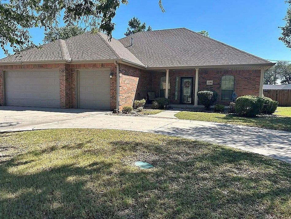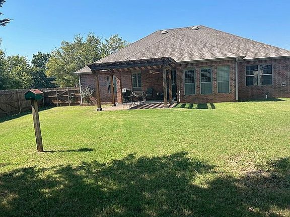 The home has a three car garage with circle drive. The back yard has a privacy fence, covered porch, and brick patio. The yard is beautifully landscaped.