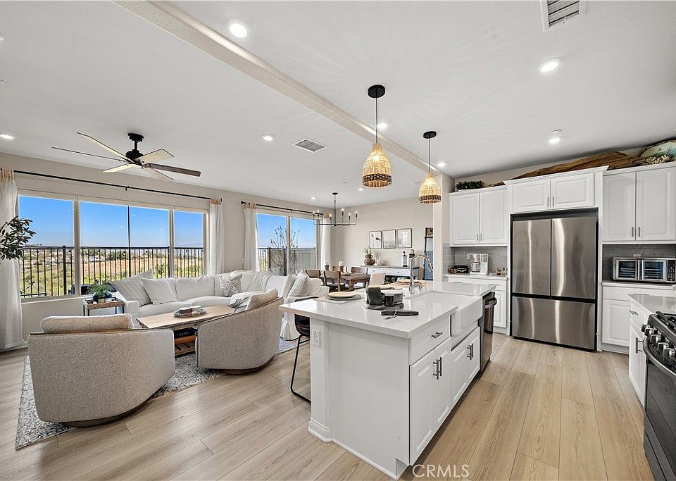 View View View! Welcome to your dream home in the highly desirable Melrose Heights community of Oceanside, California! Enjoy breathtaking panoramic views of the surrounding natural backdrop and rolling hills to the local mountains. This stunning newly built townhouse features a 2-story, open-concept floor plan with 3 bedrooms, 2.5 bathrooms, and 1,745 square feet of beautifully designed living space that truly shows like a brand-new model home. From the moment you step inside, you’ll be impressed by the thoughtful upgrades, modern finishes, and luxurious vinyl plank flooring throughout. The bright, spacious living area is filled with natural light from expansive windows. It features recessed lighting and designer touches including ship-lap walls, upgraded light fixtures, and electronic zebra blinds that provide the perfect combination of style and functionality. The chef-inspired kitchen boasts a large island with farmhouse sink and barstool seating, quartz counters & white raised panel cabinets that create a timeless and clean aesthetic, walk-in pantry with under-stair storage, and stainless steel appliances. A convenient half bath downstairs features upgraded cabinet & mirror. 2-car attached garage w/direct access provides security and easy entry. Upstairs, the primary bedroom offers a true sanctuary with its expansive window framing the stunning natural views. A ship-lap feature wall and elegant chandelier add a touch of luxury. The en-suite bathroom continues the upgraded experience with dual sinks, stylish upgraded mirrors, modern fixtures, & walk-in closet. The combination of comfort and thoughtful design makes this owner’s suite a place you’ll look forward to retreating to each day. Two additional secondary bedrooms features batten and board wall details, giving them a designer feel. The hallway bathroom is equipped with dual sinks, and enclosed tub & shower. There's also a comfy open loft & dedicated laundry room w/sink. Step outside to a custom landscaped paver tile patio, seating area, and fire feature, perfect for relaxing or entertaining while taking in the breathtaking views. Paid solar panels provide energy efficiency and lower utility costs. Melrose Heights offers resort-style amenities: a pool, spa, playground/tot lot, entertainment area with firepit, BBQs, and picnic seating. Located near shopping, dining, and public transportation, this move-in ready home delivers the perfect blend of modern style, function, and community living.