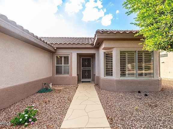 Welcome to Sun City Grand! This charming 2-bedroom home offers the perfect blend of comfort and community living. The open great room layout is ideal for entertaining, featuring wood-look flooring, neutral tones, and plenty of natural light. The kitchen includes ample cabinetry, generous counters, built-in appliances, and a breakfast bar for casual dining. The spacious primary suite boasts a bay window, dual sinks, and a walk-in closet. Relax on the screened-in patio overlooking a peaceful walking path — with no neighbors behind! Enjoy resort-style amenities and an active, friendly lifestyle in one of the area's most desirable 55+ communities.