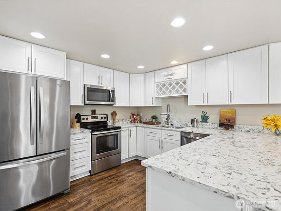 $5000 Buyer Credit! Welcome Home to Palm Court & this beautifully updated 3 Bedroom +extra finished Room +2 1/2 Bath GEM in gated community! You'll love gleaming Hardwood floors, Skylights, walls of windows & more. Bright open Living Room w/ gas Fireplace & vaulted ceiling, spectacularly remodeled Kitchen w/ granite counters, stainless steel appliances & Sitting Bar, Dining area w/ Slider out to Patio & lovely fenced Yard! Spacious Primary Bedroom w/ sumptuous 5-pc Bath soaking Tub & separate Shower +adjoining Bonus Room w/ Skylight (Den, Nursery, Workout Room). 2 more spacious Bedrooms +2nd full Bathroom. 2-car Garage. Great HOA covers landscaping, outside maintenance +interior security. Close to shops, restaurants, transit. Welcome Home!