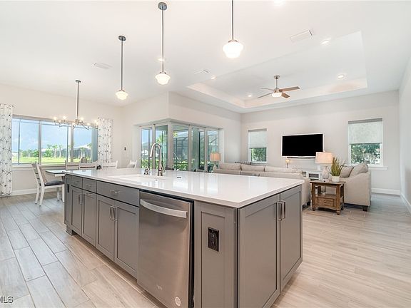 Better than new and customized with post builder luxury enhancements, this Renown (Echelon Series) offers over 2,800 sq ft with 3 ensuite bedrooms + den/flex and a premium water view. The gourmet kitchen showcases white quartz (kitchen and walk-in pantry), coffee bar and wine bar, upgraded lighting, and a Culligan water softener + reverse-osmosis drinking system with a filtered refrigerator line. Storage is elevated by Closet Factory custom systems in the primary walk-in, pantry, and den—complete with cabinets, shelving, pull-out trays, and integrated lighting. Zero-corner sliders open to an oversized lanai designed for entertaining, where the pool/spa has been converted to a saltwater system, complemented by patio privacy shades. Whole-home comfort includes 3 Day Blinds window shades plus motorized curtains in the dining room and primary bedroom. Robust storm protection features impact windows and Storm Smart hurricane shades on the lanai and front door (additional storm shade at the front entry). Thoughtful touches continue with a guest bathtub/shower glass enclosure and a 3-bay garage outfitted with an epoxy floor, 220V charging outlet, and Gladiator steel cabinets. Enjoy the new amenities center with a restaurant, fitness studio, pickleball, bocce, and a large tropical pool with lap lanes—all in the amenity-rich 55+ Del Webb Oak Creek community, minutes to RSW and Punta Gorda (PGD) airports, and close to shopping, dining, and entertainment. Skip the wait for a new build and the expense of upgrades—this one is done.