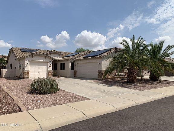 Enjoy super-low APS bills in this highly sought-after floorplan in Sierra Montana with owned solar-no payments. Easy to care for low-maintenance landscaping. The open, split floorplan has plenty of space for entertaining. The kitchen is perfect for gathering around the center island. Custom tile accents and freshly painted cabinets. A functional work from home space off the kitchen and great room. The spacious master bedroom and en suite bathroom has a separate soaking tub and shower, along with a generous walk-in closet. Two additional guestrooms and bathroom are located on the east side of the home. Event he garages are split. Enjoy the peaceful backyard, no neighbors directly behind you. Terrific location in west Surprise, close to Prasada and the new Sterling Grove Golf Course.
