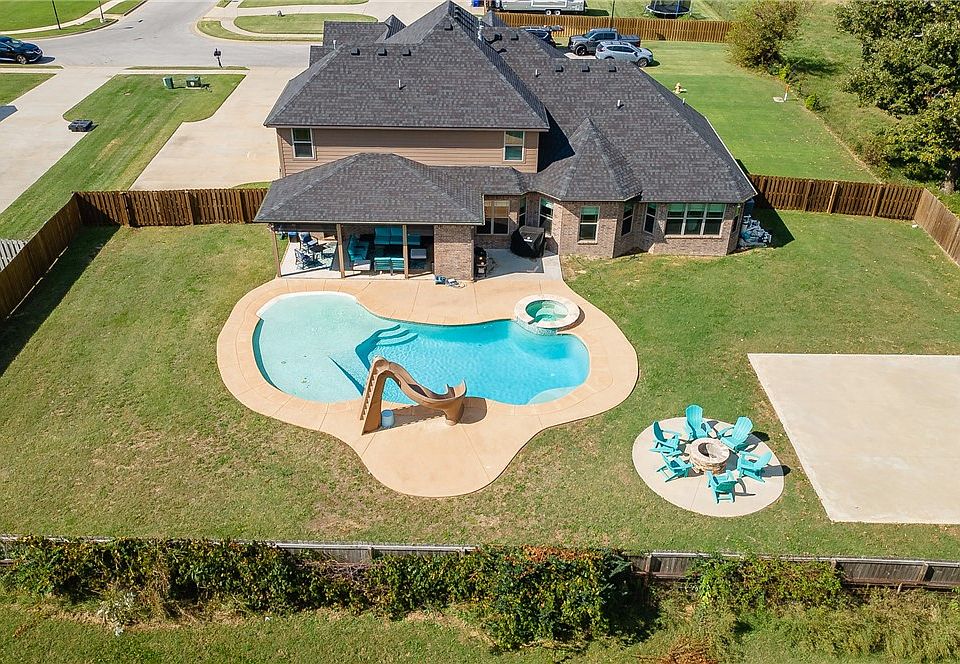 Set on a scenic half-acre corner lot in Elm Springs, this 5-bedroom, 4.5-bath home offers exceptional space, comfort, and style. Outdoor living shines with a sparkling pool, half basketball court, and covered patio ideal for entertaining. Inside, the thoughtful floor plan includes three ensuite bedrooms, two on the main level including the spacious primary suite with an oversized walk-in closet, plus one upstairs, along with two additional bedrooms connected by a double bath. A dedicated office, formal dining room, and generous bonus room provide flexibility for work and play. The 3-car garage adds convenience and ample storage. Blending elegance with function, this home sits in a peaceful neighborhood with quick access to everything Northwest Arkansas has to offer.