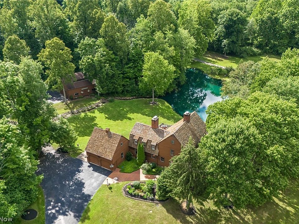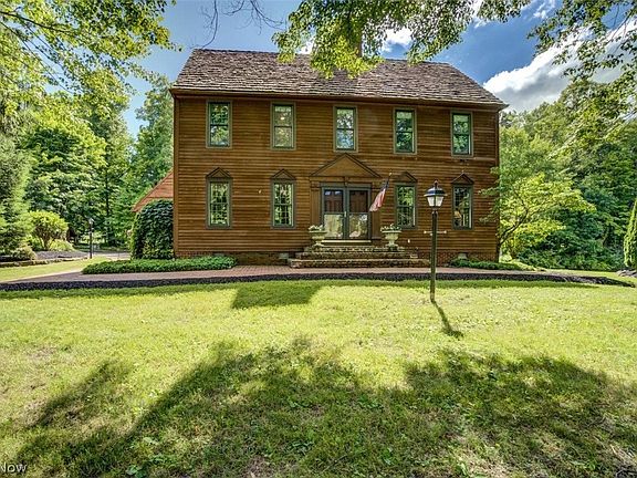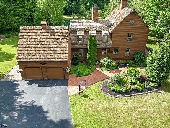 Welcome home to an idyllic retreat, nestled on 3.7 acres of breathtaking scenery featuring serene ponds and majestic hundred-year-old trees. This unique property combines superb Saltbox architecture with attention to detail, along with notable improvements, including an inviting guest house. The “barn”, fully finished with a bedroom, kitchen, and full bathroom upstairs is a highlight to this special property. The first floor offers incredible space for living and entertaining, including a half bath and a fabulous wet bar with fridge. The main house boasts gracious living areas, remodeled kitchen and bathrooms, and a striking sunroom with walls of glass. Enjoy tranquil water views from numerous rooms. There’s also a partially finished basement, a large shed, AND an unfinished third floor with full stairs from the second floor, unlocking even more potential. Enjoy the tranquility of a secluded setting while being just moments away from top-rated schools, shopping, the vibrant Village of Chagrin Falls with its many restaurants and shops, and Route 422 (only ~25 mins to CLE). Rare opportunity to own a piece of paradise with timeless architecture and modern comforts, offering both privacy and accessibility!