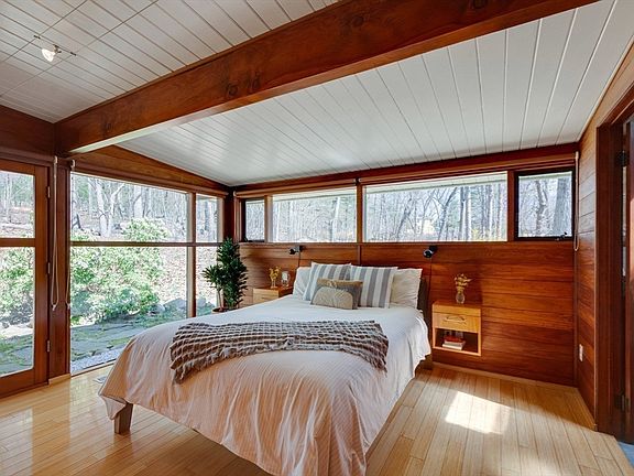 Updated architect-designed Mid-Century Modern Contemporary highlighted by its design simplicity and indoor/outdoor connections is a not-to-be-missed jewel. Set well off the road, this captivating home, framed by mature landscaping and well-crafted hardscape features a masterfully renovated kitchen and updated baths, a spacious living room with woodstove and custom display cases, and a dining area with direct access to a stone patio. Vaulted ceilings and skylights are enhanced by walls of windows that introduce serene views of its natural setting. A detached carport includes extra storage - just a few steps from the mudroom entry. This welcoming home offers a rare opportunity for those who value nature, Mid-Century Modern architecture as well as easy access to the nearby trails of Minuteman National Park and major commuting routes.