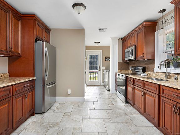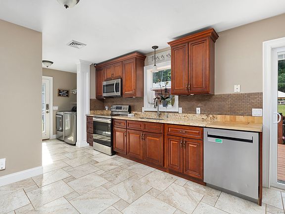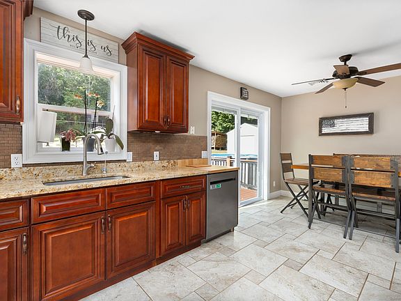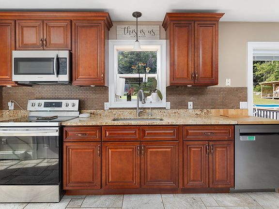 Your dream home has arrived! This 3-bedroom, 2-bath raised ranch with an oversized 1-car garage combines modern comfort, energy efficiency, and incredible outdoor living. Step inside to an open floor plan where a spacious living room flows into the stunning kitchen and dining area, complete with custom cabinetry, stainless steel appliances, granite countertops, tiled floors, and sliding glass doors that lead to your deck. The laundry is tucked conveniently off the kitchen. The primary suite boasts double closets and a private bath with shower, while two additional bedrooms and a full tiled guest bath complete the main level. Get ready to entertain! The huge backyard is your private retreat with trails, a 16x22 shed, a firepit, cement patio with gazebo, hot tub, and a built-on deck leading to the pool. Every detail is designed for fun, relaxation, and gatherings. Recent upgrades include central air with a heat pump for heating and cooling, new laminate flooring, and a roof just 5 years young. Solar panels add efficiency, and you'll love the choice of heating with oil, wood stove, or heat pump. Audiovisual surveillance on property.
