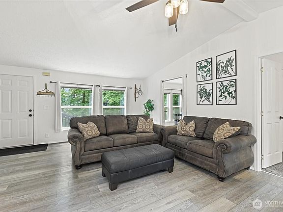This beautifully updated 2 bed, 2 bath home sits on 5 serene acres offering unmatched privacy. Fresh exterior and interior paint and tastefully remodeled bathrooms blend comfort with style. A dedicated office/den provides flexible space for work or hobbies. Bask in natural light streaming through the redwood cedar skylights, enhancing the home's warm and inviting feel. On clear days, take in breathtaking views of Mt. Rainier and Mt. St. Helens. Backing up to timber company land, enjoy peace, seclusion, and the beauty of the surrounding Pacific Northwest landscape. RV Parking and conveniently located just minutes from I-5.