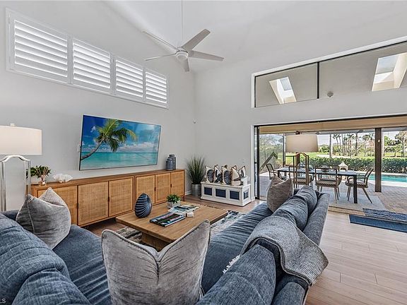 The ideal Naples retreat awaits in this fully remodeled and furnished villa in the private enclave of Eagle Creek Country Club. Boasting two bedrooms plus a den, or third bedroom, and two baths, this light and bright residence has been beautifully updated throughout. Some of the upgrades include new laminate and tile flooring, a new kitchen with quartz countertops, stainless steel appliances including a wine refrigerator, new moldings, new paint, all-new luxurious baths, premium furnishings plus more! The home’s floor plan features a large great room with soaring ceilings that is open to the kitchen and dining area. This incredible space is framed by the inviting lanai and sparkling swimming pool with a panoramic screen enclosure, ideally capturing mesmerizing views of the golf course beyond. The owner’s suite is a relaxing haven with a large walk-in closet and beautiful bath, while the guest bedroom and den are privately situated with a spacious bath nearby. In addition, this villa also features a spacious two-car garage and electric storm shutters on the lanai. Eagle Creek is a lush and intimate community halfway between Naples and Marco Island, making it an ideal location. Social membership is required, or buyers can take advantage of the club's social golf program, offering instant golf access to those who join the membership waitlist.