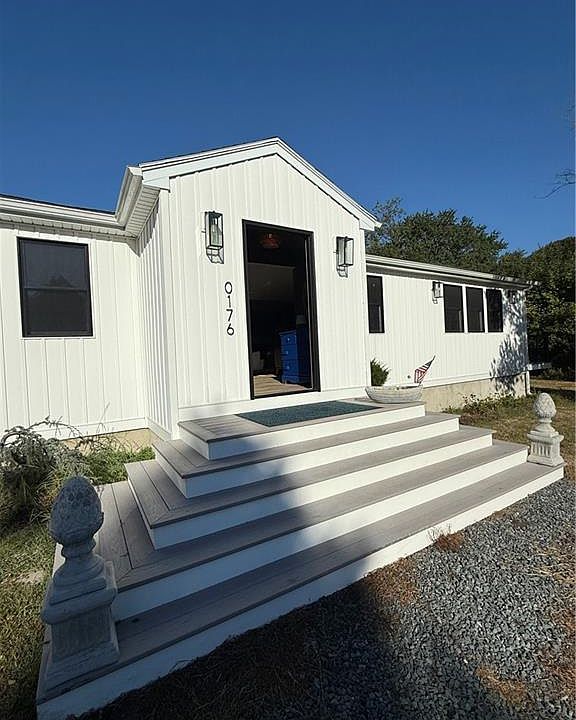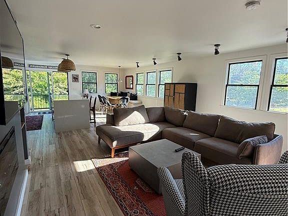 Welcome to 0176 Daniel Ave on beautiful Prudence Island Completely remodeled in 2020, this 2 bed ranch blends modern design with island charm. The attention to detail is evident the moment you arrive, greeted by the grand staircase leading into an open-concept designed for comfort and entertaining. The living room showcases a custom statement wall with built-in bookshelves, large TV, & an electric fireplace - perfect spot to relax on cool fall evenings. The stunning kitchen features a full subway tile accent wall, farmhouse sink, stainless appliances, & a show-stopping range hood. The oversized island with waterfall edges includes a wine fridge, microwave drawer & abundant storage. Just off the kitchen, the dining area offers built-in corner seating for cozy gatherings. The spa-inspired bathroom boasts a walk-in tiled shower, soaking tub, & a convenient laundry closet w/ washer and dryer. Mini-splits throughout the home provide efficient heating & cooling. A slider off the kitchen opens to a spacious deck, ideal for entertaining. A ladder leads to the surprise rooftop deck where you’ll enjoy water views perfect for morning coffee or sunset cocktails. Additional features include an outdoor shower & a beautifully finished 2-car garage with endless possibilities: gym, game room, or creative retreat. This unique property spans three lots: one with the home, one with the garage, & an additional vacant lot. Some furnishings will convey, making this retreat move-in ready. SOLD AS IS