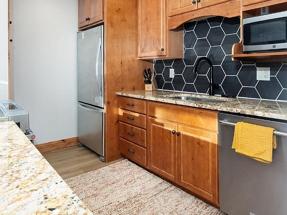 Positioned in the heart of Dillon, this tastefully updated top-floor condo is just steps away from the Dillon Marina, Amphitheater, parks, restaurants, and year-round recreation. Inside, this spacious 2-bedroom, 2-bath unit features vaulted ceilings and an open living, dining, and kitchen layout, creating an airy living space filled with natural light. Recent updates include new carpet, luxury vinyl in the kitchen, entry, and bathrooms, new trim and doors, alder cabinets, granite countertops, and stainless-steel appliances. The bedrooms sit on opposite sides of the unit for ideal privacy, and the in-unit washer/dryer adds everyday convenience. A generous southwest-facing deck provides excellent sun exposure along with lake and mountain views. With a dedicated storage closet across from the entry, an additional ski locker and open bike storage located in the building, this condo offers ample storage for any outdoor enthusiast. Lake Cliffe’s amenities round out the lifestyle with an indoor pool, hot tub, exercise room, outdoor grills/firepit area and a large shared lawn. This is an amazing opportunity to own a top-floor retreat in one of Dillon’s most desirable lakefront complexes.