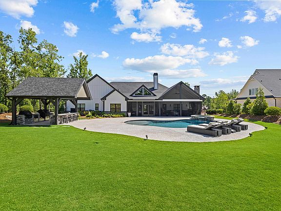 Your Private Oasis Awaits! Welcome to this exquisite luxury residence nestled within the prestigious gated community of Harmony Bay. This stunning home offers two assigned slips witihin walking distance, providing the perfect backdrop for your lake life living. Step into your own private oasis with over an acre and a half, where the backyard is designed for entertaining family and friends. Immaculately maintained, the property features professional landscaping, beautiful lake views and an extended three-car garage, ensuring both beauty and practicality. The very open floor plan boasts beautiful hardwood floors, tongue-and-groove ceilings, and a striking stacked stone fireplace, creating an inviting atmosphere throughout. Recently added, the brand-new screened-in porch with an outdoor fireplace and a poolside pavilion, complete with an outdoor kitchen, enhances your entertaining options. Retreat to the large master suite, which offers direct access to the screened-in porch. The suite features custom closets and a spa-like master bathroom equipped with a double vanity, a luxurious garden tub, and a walk-in shower. The gourmet kitchen is a chef's dream, complete with a spacious island, a wet bar, and stainless steel appliances, making meal preparation a delight. The main level also includes three additional guest bedrooms, each with private baths, ensuring comfort and privacy for your visitors. Discover the fully finished large bonus room above the garage, which also includes a private bath, making it a versatile space for guests, a home office, or a media room.Don’t miss the opportunity to own this remarkable home in Harmony Bay, where luxury meets lake life. Schedule your private showing today and experience the perfect blend of elegance and relaxation! Majority of the furniture is negotiable on separate bill of sale. Schedule your private showing today!