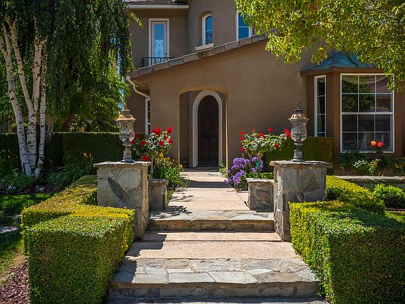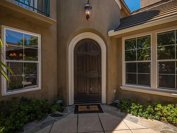 Gate guarded neighborhood in Wood Ranch Long Canyon. This view home has 4 Bed/3.5 Baths including a main floor master suite.Private entry courtyard with beautiful architectural detail. Impressive Foyer, spiral staircase,formal living room w/fireplace, oversize dining room both with crown moldings. Spectacular gourmet kitchen w/staggered maple cabinets for enhanced beauty. Center island with granite counter tops, veggie sink w/breakfast bar, outfitted with stainless steel double ovens, dishwasher,refrig. Opens to the huge family gathering room w/built-in media niche, cozy fireplace. The unassuming door right off the family room-who would guess that it leads to the luxurious master suite, incredible master bath and walk-in closet.French doors lead to the finished covered patio with recessed