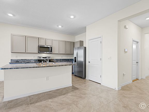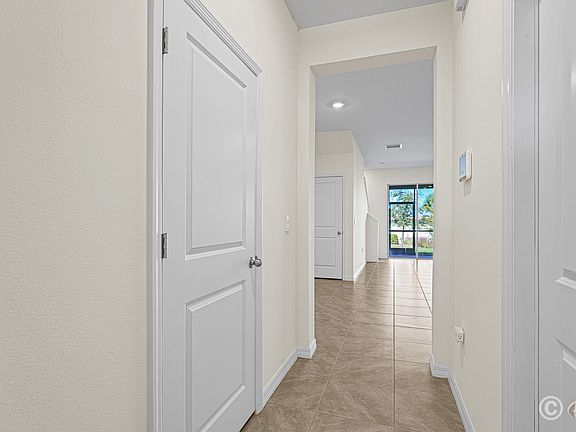 The welcoming entryway opens into a bright, open-concept main level where the kitchen, dining, and living areas flow together seamlessly. The contemporary kitchen features a generous center islandideal for casual meals or entertainingand overlooks the inviting living room and dining area. Glass sliders lead to a covered and screened lanai, providing a relaxing outdoor retreat to enjoy the Florida sunshine.