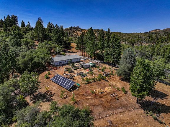10.41 Acres with amazing views of the Sierra Nevada Mountains. Home is in good condition and has been well updated. Two car detached garage is also included. Very low power bills with energy features include a 10.1 KWP owned ground mountain solar system, a battery back-up system, and a tankless water heater. The home has split unit/ductless heating and air. A 2nd septic system and building pad, could be used for RV use, or future 2nd home. Home has large garden area, raised potting beds, a chicken coop with fencing, storage shed, well shed, and water storage tank. The home is a two bedroom with a den/office. Den/office could function as a third bedroom if desired. Inside laundry area attached to the kitchen. Includes fridge, washer, and dryer with no warranty. 4 Peach Trees, 1 Apple Tree-Multi-Variety, 1 Cherry, 1 Pear, and tree-nuts also located in the garden area.