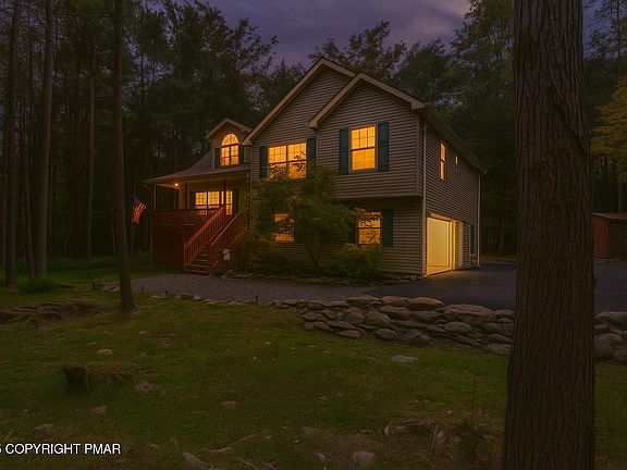 *Property is under contract but accepting back up offers at this time!* Welcome to a true Poconos Home! Enjoy the wildlife in this beautifully wooded acre of land, including your very own creek to explore. The peaceful, secluded feel with town-life and Poconos attractions only minutes away. This 4 bedroom/2.5 bathroom split-level /raised ranch offers a primary bedroom with walk-in closet & bathroom suite, an even larger bedroom with beautiful cedar accents, a family room for more room for fun, a stone-faced fireplace in the living room, central air/forced heat, hard wood flooring, a large, paved driveway for ample parking, a 2 car garage, a partial basement, a utility shed, and an outdoor bar. For only $400/year, the community offers two lakes, allowing fishing, boating, & swimming, a tennis/pickleball court, a volleyball court, and a clubhouse. As your personal Poconos retreat, next investment, or simply your new everyday dream house ... your search ends here! Be sure to check out the virtual tour and video!