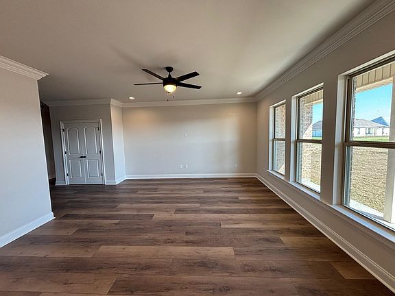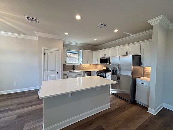 The RAVENSWOOD V A in The Settlement at Live Oak community offers a 4 bedroom, 2 full bathroom, open design. Features: double vanity, garden tub, separate shower, linen closet, and 2 walk-in closets in the primary suite, a kitchen island overlooking the living room, covered front porch, covered rear patio, custom framed mirrors in all bathrooms, ceiling fans in the living room and primary bedroom are standard, smart connect wi-fi thermostat, smoke and carbon monoxide detectors, post tension slab, landscaping, architectural 30-year shingles, flood lights, and more! Energy Efficient Features: a tankless gas water heater, a kitchen appliance package with a gas range, low E tilt-in windows, and more!