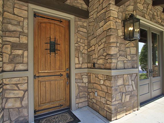Custom stone fireplaceHandscraped hardwood flooringGranite countersSynthetic wood deckingGas commercial cook topExposed wood truss ceilingGourmet kitchen