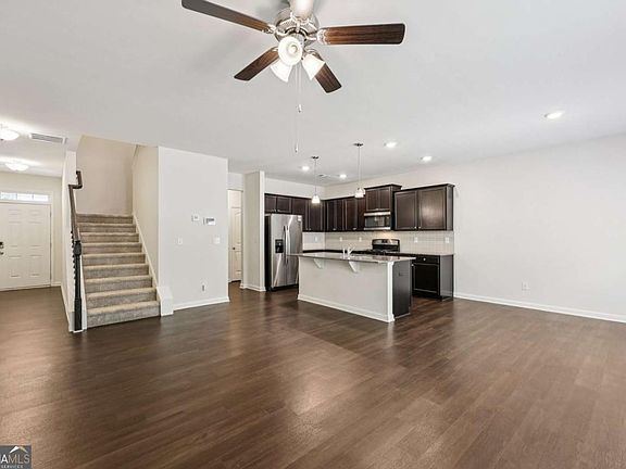 Move-in ready home offering fresh updates and everyday convenience! The main level features beautiful, low-maintenance vinyl wood flooring throughout. Enjoy a bright, open-concept living room with plenty of natural light and a cozy fireplace, flowing effortlessly into the stylish kitchen with a large island with seating, granite counters, stainless steel appliances, and generous cabinet storage. A half bath completes the first floor. Upstairs, the primary suite impresses with a tray ceiling, en-suite bath with dual sinks, soaking tub, separate glass shower, and two walk-in closets. Two secondary bedrooms share a full hall bath, and the laundry room is conveniently upstairs as well! Outside, relax on the spacious patio ideal for grilling and entertaining, plus a private green space backing to woods. Two storage areas provide extra organization! Recent updates include fresh caulking and exterior pressure wash, plus all wood trim painted including fascia, soffits, gutters, and downspouts. Fantastic location near Hwy 92-schedule your showing today! Mortgage savings may be available for buyers of this listing.