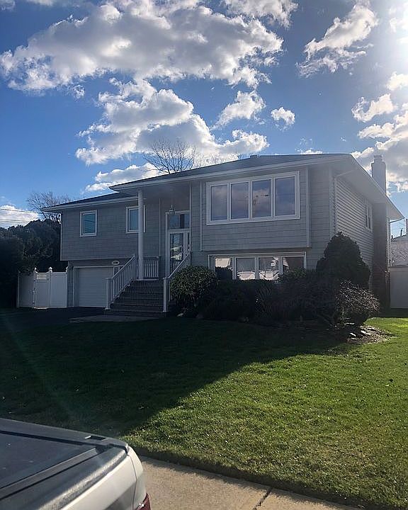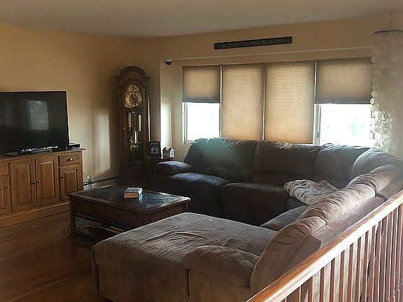 For Sale By Owner - Wide Line High Ranch on oversized property. Meticulously maintained. Beautiful oak floors throughout -wide open floor plan with lots of natural light, ideal for large family gatherings. Cherrywood kitchen with stainless steel appliances and large granite island. 4 total bedrooms with 3 full baths. King sized master bedroom with en suite bath. Office/guest room with slider onto 200 sq. ft deck. Large 1st floor family rm/den, with stone fireplace and sliders onto large slate patio as well as a king sized bedroom with full bath. Attached, 500 sq. ft., 2 car garage is heated. 6 zone inground sprinklers. Outdoor features include 1 covered, 2 uncovered patios. Plenty of room for family bbqs as well as room for garden. Recent updates include 200 amp service, oak floors throughout 1st floor family rm and bedroom, baseboard heating throughout, 2-6' sliders, all interior doors. Newer roof, windows, vinyl siding, and gas boiler. Possible in law suite or home based business with proper permits. Taxes do not reflect STAR reduction of $1517.00