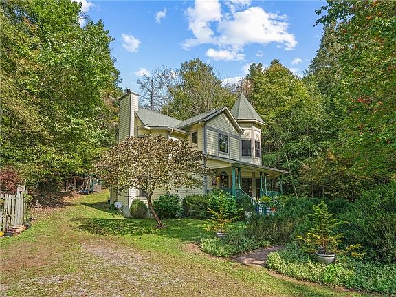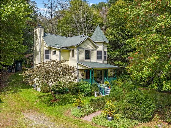 A rare opportunity to enjoy a magnificent private waterfall, just steps from your own backdoor. This modern move-in ready Victorian has a detached well appointed guest home/vacation rental with a 2 car garage and office space. Imagine the soothing sounds of the waterfall as you relax under the large, open air pavilion designed using reclaimed wormy chestnut beams. Over 11 magical acres with organic fruit trees, gardens, two creeks, hiking trails, and several springs. Immerse yourself in the peace and quiet of this tranquil place by soaking in the hot tub, sitting by the koi pond, or relaxing by a warm fire. An easy 30 minute drive north of Asheville in the beautiful Prices Creek Valley! Must see to appreciate the limitless possibilities!