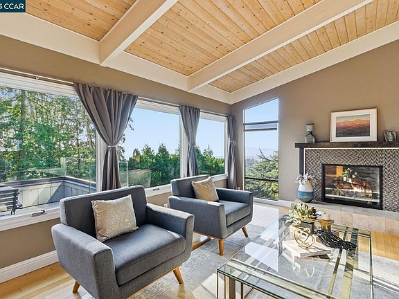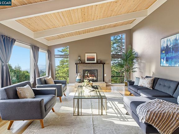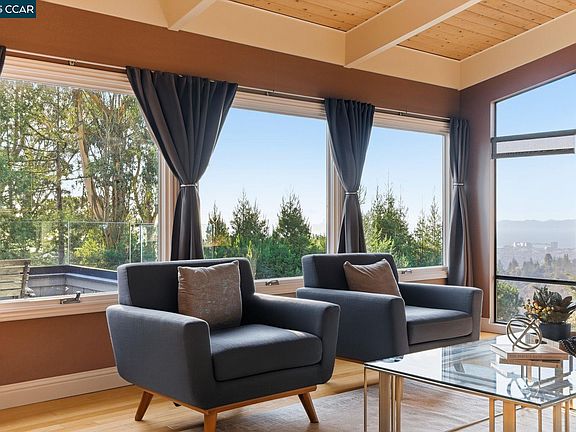 Panoramic San Francisco Bay views await you in this modern, highly updated East Bay home above it all. With an excellent floorplan and beautiful spaces this home is both expansive and cozy. Vaulted ceilings and a beautiful fireplace add to the Bay views in the living room. Open kitchen design with a large island and gorgeous Granite countertops. High-end appliances, including a Thermador 6 burner stove, and bathroom fixtures throughout the home add contemporary styling and beauty. Beautiful Hard Wood floors throughout. A large deck off the kitchen adds to the charm of quintessential California Indoor/Outdoor living, and there is a large, private patio off the master bedroom suite. Plus, there is a large home office and bonus guest bedroom!