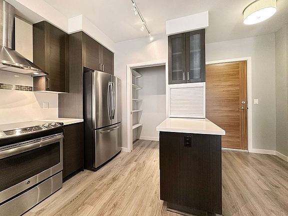 Features include wood floors, high ceilings, kitchen with cascading quartz counters, stainless appliances including built-in wine cooler and walk-in pantry, one bedroom with walk-in closet and built-in safe, bonus area, one bath, balcony, and laundry in unit.