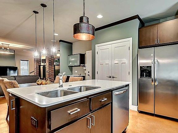 OPEN HOUSE SATURDAY!! 1-3PM. THIS IS A STUNNING CONTEMPORARY TWO BED HOME WITH OPEN STUDY/OFFICE AREA. ONE OF VERY FEW Jeff Click homes in the Silverhawk Addition in Edmond. Open floor plan with exposed brick showcasing a sleek, modern kitchen with large quartz iisland and built-in seating area. Quartz counters, a large pantry and a built-in dining table. The office is a great industrial space with natural light. Use of brick accents throughout. Sinks are custom grey cement!! The Master Suite is quietly tucked away in the back of the house. Master has a large walk in closet which is attached to the laundry room for ease and convenience.modern outdoor entertaining area with built-in fire pit, an extended patio, TV mount, gas grill hookup, modern gas fireplace, and privacy features. Neighborhood pool and playground! The location provides easy access to turnpikes, Mercy Hospital, Lake Hefner, the great shopping and restaurants at Chisholm Creek and around Quail Springs Mall.