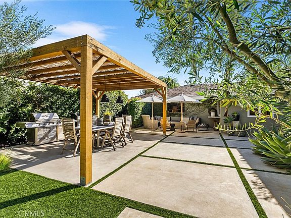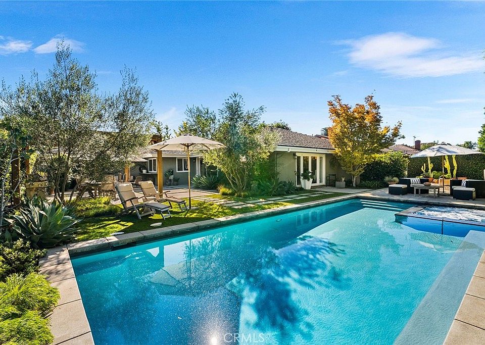 Step into your dream home — a single-story showpiece offering 2,330 square feet of designer living on a 10,375-square-foot flat lot in one of Tustin’s most desirable neighborhoods. This move-in-ready single-story blends modern sophistication with a fun mid-century vibe and even offers room for future expansion. Inside, discover bright open spaces with designer finishes throughout — from the warm wood floors to the statement lighting and marble accents. The bright living room with a chic fireplace and dining area overlooking the front garden set the tone for effortless, elevated living. The gourmet remodeled kitchen impresses with custom cabinetry, marble counters, a 6-burner Wolf range and oven, stainless appliances, and a sleek pass-through window that opens to the entertainer’s backyard. The kitchen flows seamlessly into the inviting family room with a built-in banquette, perfect for casual dining or cozy gatherings. Three generous bedrooms and 2.5 spa-inspired bathrooms shine with the latest designer details. The primary bedroom complete with a walk-in closet and new glass patio doors open to your backyard oasis remodeled within the last five years. The professionally landscaped entertainer’s paradise features a sparkling pool and spa, multiple patios, a fire pit lounge, and a versatile yard designed for flex space or room to expand. Whether you’re hosting a dinner party or a weekend poolside hangout, this yard delivers space, style, and privacy. Bonus features include an indoor laundry room, 3 car garage with direct access, and top-rated Tustin schools including Foothill high school. Welcome home to California living at its finest.