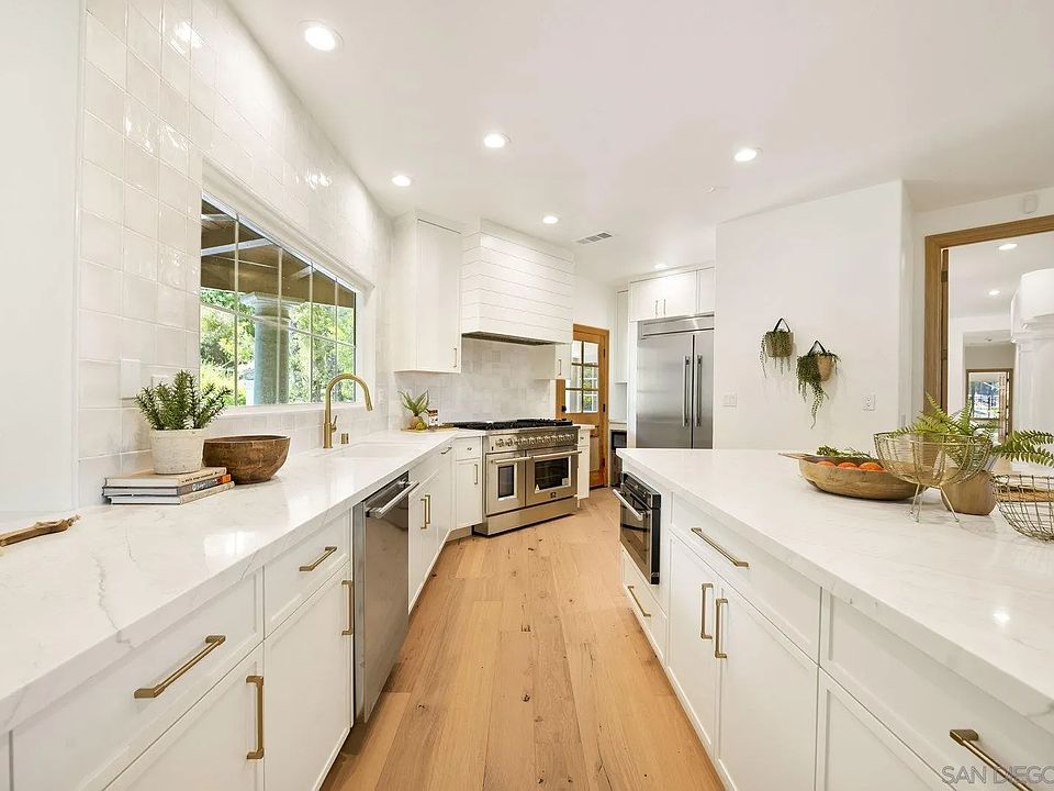 Stunning Renovated Single-Story Corner Lot Home with Designer Touches Throughout. This single-story home, ideally situated on a spacious corner lot. From the moment you step inside, you’ll be captivated by soaring wood-vaulted ceilings, an elegant updated chandelier, and wide-plank engineered hardwood flooring that flows seamlessly throughout. The grand entrance leads into a warm and inviting family room, perfectly positioned with direct access to your own private oasis—complete with a sparkling pool and relaxing jacuzzi. The expansive primary wing is a luxurious retreat, featuring an executive office, a tranquil atrium, and an impressive ~1,000 sq ft primary suite. The spa-inspired primary bathroom boasts dual-head showers, his-and-hers vanities, dual walk-in closets, and a freestanding tub beneath a stunning overhead light fixture and vaulted wood ceiling. The chef’s kitchen is a showstopper with custom soft-close slim shaker cabinetry, marbled quartz countertops, and a pearl tile backsplash extending to the ceiling. The adjoining wet bar is equally refined, creating a perfect space for entertaining. The north wing includes a second serene atrium and two well-appointed bedrooms connected by a luxurious Jack-and-Jill bath featuring a shared overhead shower and a freestanding soaking tub. A fourth bedroom includes its own private ensuite and matching custom cabinetry. Additional features include new paint, baseboards, dual AC, and a brand new roof! This turnkey property is the perfect blend of modern luxury and custom design