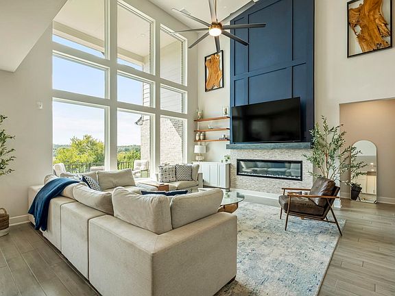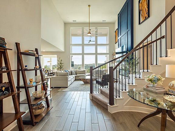 This gorgeous two-story home in the Sweetwater Ranch subdivision with many amenities welcomes you with a stunning rotunda entry featuring a chandelier and a wrought iron circular staircase. The gourmet kitchen includes an oversized quartz center island with a built-in sink, quartz countertops with a tile backsplash, 42" upper cabinets, a built-in microwave and electric oven, a gas cooktop, and a butler’s pantry. The family room features high ceilings and a wall of windows overlooking the trees and wooded greenbelt. The private primary suite downstairs offers a large bedroom with three tall windows, a tray ceiling, and an oversized ceiling fan. The luxurious primary bathroom includes separate quartz vanities, a large walk-in tiled shower with glass doors, a soaking tub, two spacious walk-in closets with built-ins, a tray ceiling, a full-length built-in mirror, and a linen closet. A second bedroom with a full bath is also located downstairs, along with an elegant office featuring wall-length built-ins and a chandelier. Upstairs includes a media room, extra living area, and three additional bedrooms. Additional highlights include a mud area with built-ins just off the garage and a convenient half bath. The covered back porch offers a high ceiling, ceiling fan, and a cozy fire pit area overlooking the serene greenbelt. The home is complete with a landscaped yard, sprinkler system, and full gutters.
