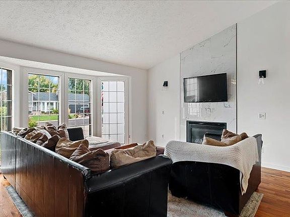 Custom tile fireplace surroundSoaring ceilingsSprinkler systemRaised garden bedsUpdated appliancesSpacious patioOversized corner lot