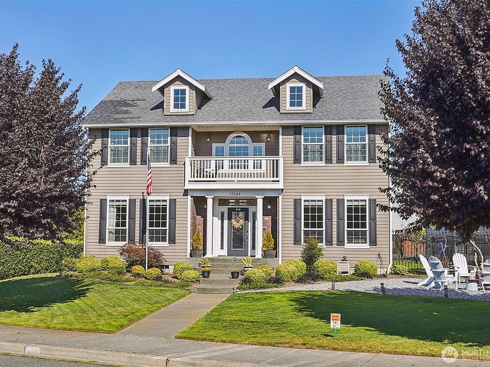 Boasting timeless colonial charm, this stunning home in Sky Island’s Panoramic Heights offers both elegance and comfort. The interior features granite counters, stainless steel appliances, hardwood floors, vaulted ceilings, a grand staircase, and a formal dining room. A butler’s pantry complements the open kitchen with eating area, flowing seamlessly into the living and family rooms. The versatile bonus room provides endless options for work, play, or hobbies. Retreat to the primary suite with its luxurious 5-piece bath and private balcony showcasing views of Mt. Rainier. Outdoors, enjoy a custom BBQ area, iron-fenced courtyard, and fire pit perfect for entertaining. Garage access off the alley adds extra convenience. Don’t miss it!