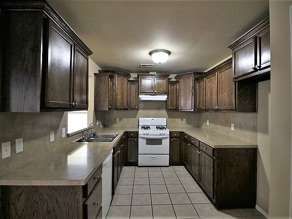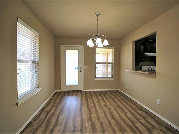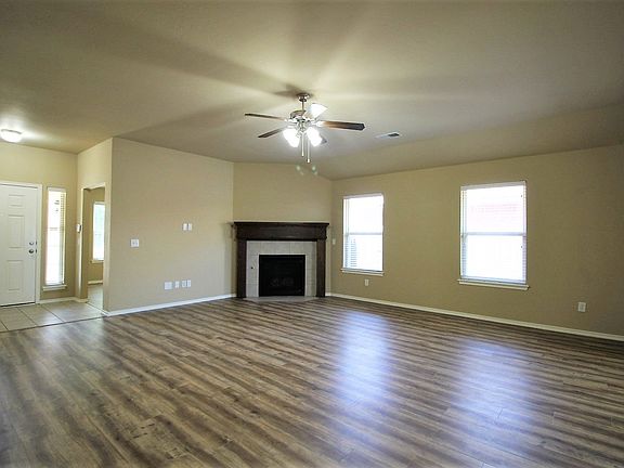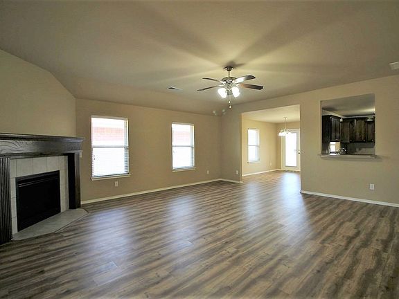 Large living room with ceiling fan, gas log fireplace and pass through window to kitchen. Kitchen has gas stove, dishwasher, disposal and pantry, plus an additional pass-through window to dining room. Master bedroom features tall ceilings and an en-suite bathroom. Ceiling fans in bedrooms. Walk-in Closets. Covered back patio. Storm shelter. HOA includes pool, clubhouse and playground. Owner pays HOA dues. Owner will consider small dog with pet deposit. No cats permitted. No smoking permitted.