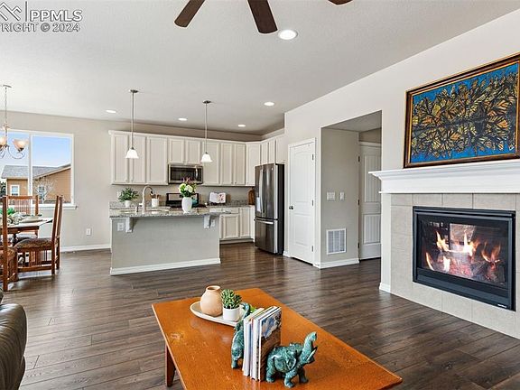 Main-level living on a large corner lot nestled in picturesque Lake of the Rockies Community in Monument – YES, PLEASE! This delightful ranch home offers a lovely blend of comfort, style, and convenience. High-quality Luxury Vinyl Plank flooring graces the main common areas, and plush brand-new carpeting adorns the bedrooms and stairs. The bright and open Great Room, featuring built-in shelving and a cozy gas-log fireplace, is ideal for gatherings or relaxing evenings. Adjacent is the gourmet well-designed kitchen, boasting beautiful granite countertops, a gas range, stainless steel appliances, a new refrigerator, ample storage with tall cabinetry, and a pantry with organized shelving. The dining space, conveniently located off the kitchen, seamlessly transitions to the back patio, perfect for outdoor dining or entertaining. The main level hosts a private Primary Bedroom retreat with an ensuite bath featuring a double vanity, large walk-in closet, and spacious walk-in shower, and a conveniently located laundry room adjacent to the primary bedroom makes living easy. Secondary bedrooms, located off the entry, provide versatile living options and easy access to a full bathroom. Downstairs, the unfinished basement offers room for expansion, including the potential for a rec room, fourth bedroom, and third bathroom, allowing for future customization. Find a serene oasis within a fully landscaped yard adorned with vibrant perennial gardens. With no neighbor to the south and enclosed on two sides, this outdoor haven offers exceptional seclusion and tranquility. Private access to Monument Lake from within Lake of the Rockies, community parks, trails, and historic downtown Monument with charming shops, restaurants, galleries, and antique stores are all within walking distance. This home offers outdoor enthusiasts many opportunities for water activities and recreation nearby in a nearly brand-new home and with the opportunity to expand – Come See For Yourself Today!