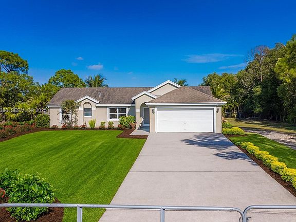 Beautifully updated 3BR/2BA home on a high-and-dry 1.15+ acre fully fenced lot in The Acreage of Loxahatchee with NO HOA. Redesigned from the original 4BR plan to create a larger open living area with volume ceilings and desirable split-bedroom layout. Bright, open floorplan with spacious living areas and plenty of room to expand. Marble tile in main living areas, kitchen and baths; real hardwood in all bedrooms. Fully remodeled kitchen with new backsplash and up to date finishes and ample storage as well as two wells on the property. Enjoy privacy and freedom. Bring RVs, boats, horses, or build your dream workshop/barn, with ample space for a pool. Quiet location just 3 lots from paved Mandarin and minutes to major paved roads: Hamlin, Seminole Pratt, Northlake, Valencia/Citrus Groves & Banyan. Close to top-rated schools, parks, riding trails, Samuel Friedland Park, and shopping. Peaceful country setting close to town. Priced to sell!